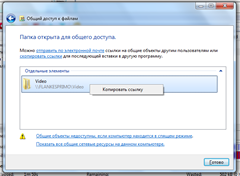 Обратите внимание, на следующее окно. В нём мы видим полный сетевой адрес папки, по которому ваш друг сможет на неё зайти. Чтобы этот адрес не переписывать вручную, можно нажать правой кнопкой мышки на папке, и выбрать опцию - “Copy link” (“Копировать ссылку”), после чего адрес можно сразу переслать другу или сохранить, например, в блокноте.
